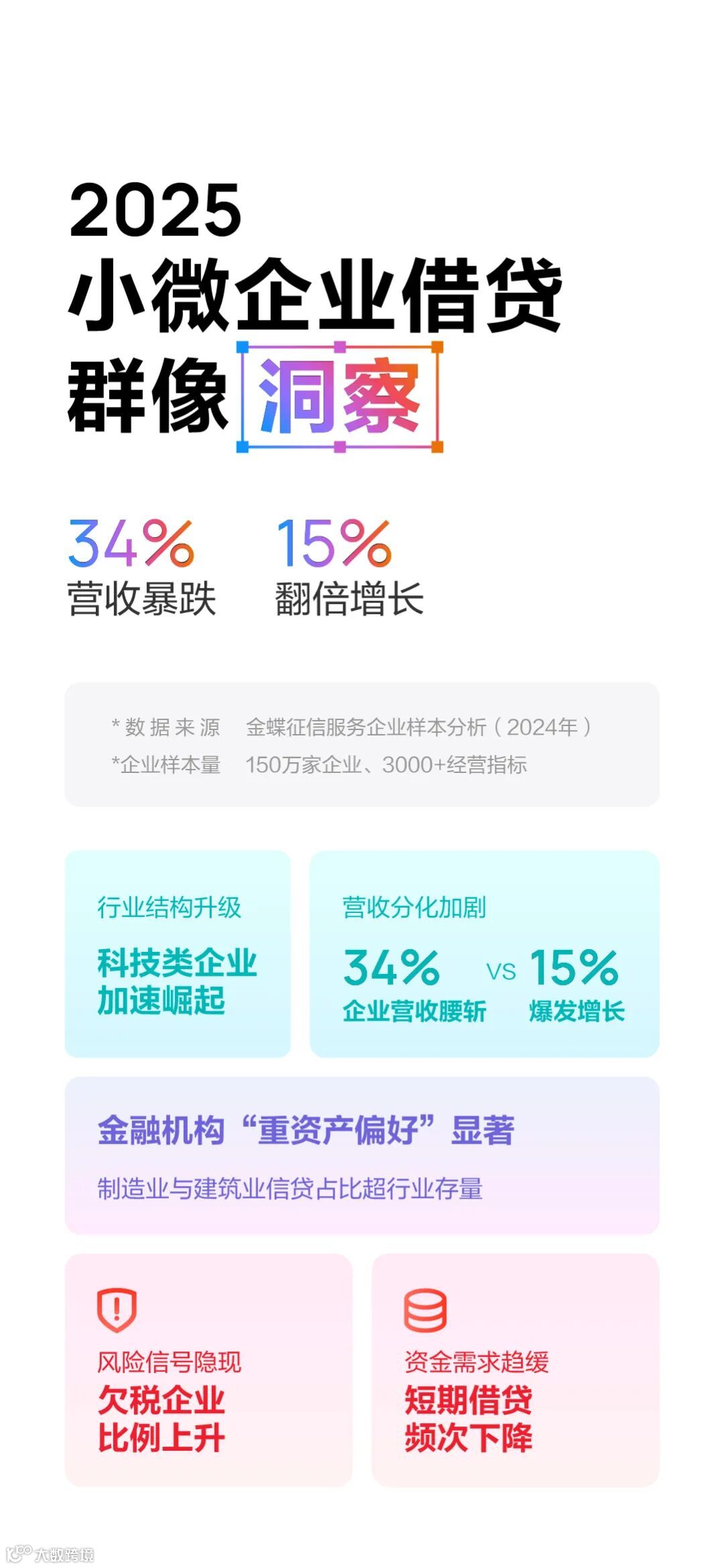 在AI大模型加速渗透与普惠金融政策深化的双重驱动下,小微企业信贷市场正加速从规模扩张向质量跃升转型。作为广东省企业信贷风险智能识别与控制大模型工程技术研究中心,本期观察,金蝶征信将抽取服务的超150万家小微企业、3000+经营指标样本,基于过去一年小微企业借贷群体在行业分布、经营质量、融资行为等方面发生的关键性变化,为您呈现2025年借贷趋势。