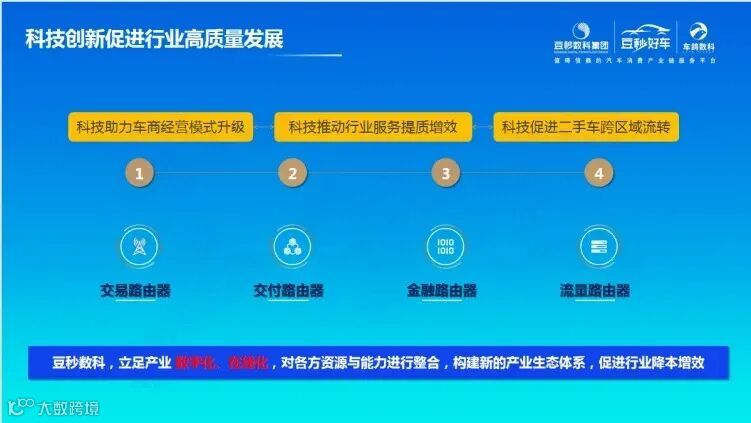 豆秒集团在企业发展中,始终大力投入科技创新,踏浪行业发展趋势,面向汽车经销商、购车消费者建立起BC协同、线上线下结合、一站式服务的产业互联网赋能平台。通过建立“流量、交易、金融、交付、人才”五大路由器,深度洞察行业痛点和需求,以AI智能、数字科技为核心战略,面向汽车经销商、购车消费者提供数字化、智能化、精准化、个性化汽车交易服务、汽车金融服务及数智科技服务。
