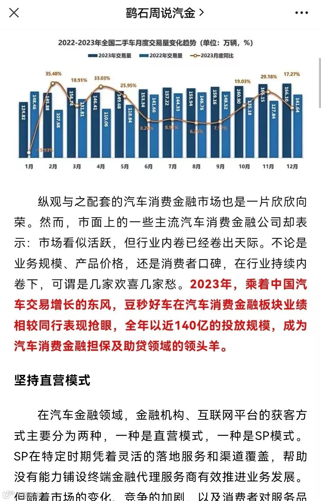 2023年,乘着中国汽车交易增长的东风,豆秒好车在汽车消费金融板块业绩相较同行表现抢眼,全年以近140亿的投放规模,成为汽车消费金融担保及助贷领域的领头羊。近期,豆秒好车这一亮眼成绩,引得行业知名大V的广泛关注,并对豆秒好车的直营模式、科技创新及新能源金融布局等方面进行了详细的报道。