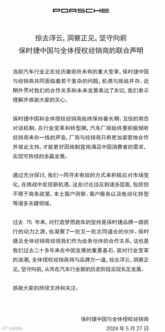 5月27日,保时捷中国方面针对此事进行回应:“当前,汽车行业正在经历着前所未有的重大变革。保时捷中国与经销商共同面临着若干复杂的问题,机遇与挑战并存。保时捷中国和全体授权经销商始终保持着长期、互信的常态对话机制。在行业变革和转型期,汽车厂商始终要积极倾听经销商来自一线的声音,厂商与经销商只有更加紧密地合作并彼此支持,才能更好因地制宜地满足中国消费者的需求,实现可持续的多赢发展。”