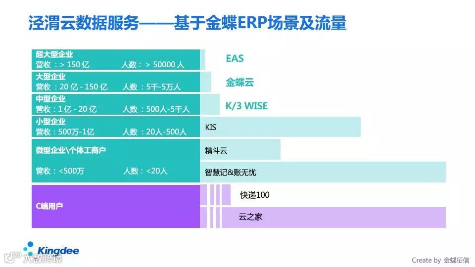 一切数据皆信用,信用是资本。谷歌母公司ALphabet董事长埃里克施米特曾经说过一句话:现在两天内所产生的数据量,是人类文明开始到2003年的总和。我们金蝶征信做什么?就是围绕企业管理软件内的基础财务数据、业务数据,结合工商司法、税务数据、交易数据等外部数据,帮助小微企业建立一个信用帐本。为什么这么说?我们金蝶就是做帐的,我这个版块也是金蝶的子公司,我们希望把金蝶平台客户帐本里面的数据信用化,来挖掘更多的金融价值。ERP的数据是非常碎片化的,可以反映企业日常真实的经营状况。首先是财务数据,比如宜家卖出一瓶水,产生一个单子,拿给会计做账,所有的财务数据实际都是反映碎片化的业务过程,都是一点一点积攒而来,逐渐形成一个帐本,到了月度或者年度的时候形成一个报表。其次与之匹配的是业务数据,销售订货、明细数据以及跨行之间的资金清算全部都是在业务系统里面。最后是行为日志,它记录了用户的所有操作行为。对于一个帐号来说,它所有的操作明细都不可篡改的被记录下来,大家看到的ERP数据反映的是结果数据,但是背后的操作行为、操作规律能深度反映数据真实记录的过程,同样值得潜心研究。我始终相信ERP是市场上对数据的刻画最为精准的软件。我们一定是市场上最稀缺的数据。