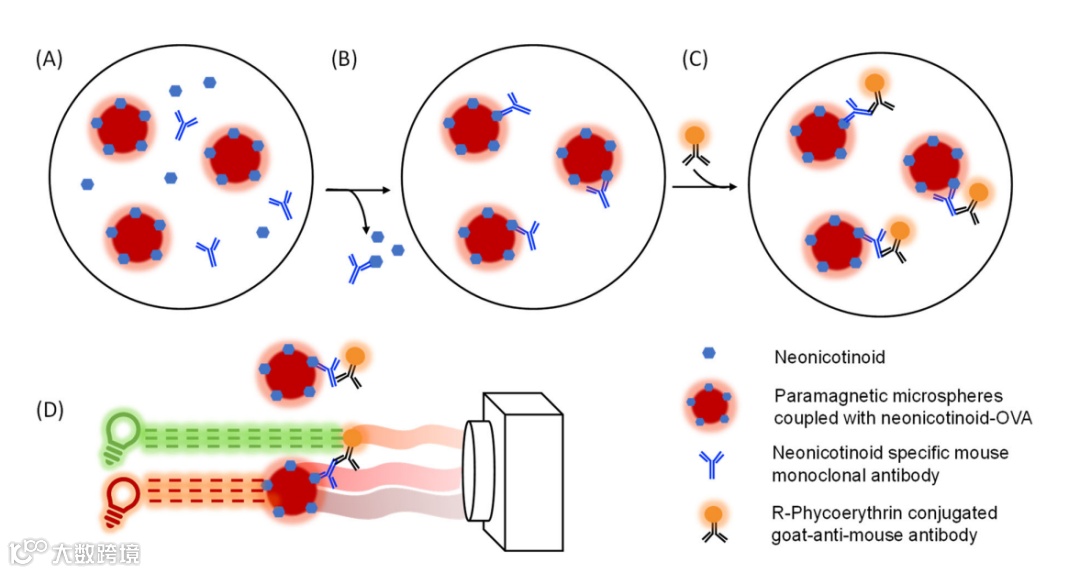 A)使用新烟碱类偶联微球与样本及新烟碱类特异抗体一起孵育