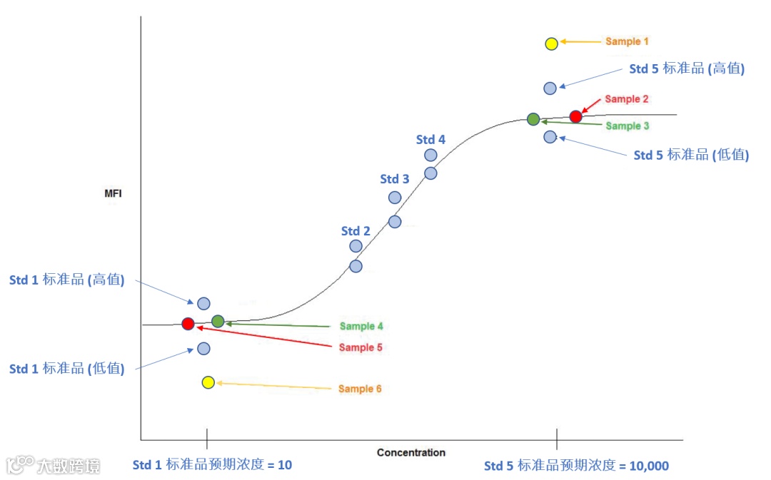 但是外推法估算出的值不一定能准确评估真实状况,特别在低于最低浓度标准品或高于最高浓度标准品时,曲线趋于水平,估算的效果会很差。因此,超过标准品上限浓度的样本,需要通过将样本稀释到标准曲线范围之内,以正确评估浓度;此外,能覆盖较大范围的标准曲线,在使用时也更加有效。藉由外推法计算的实验结果,在报告上会以 "Extrapolated" 进行注记。