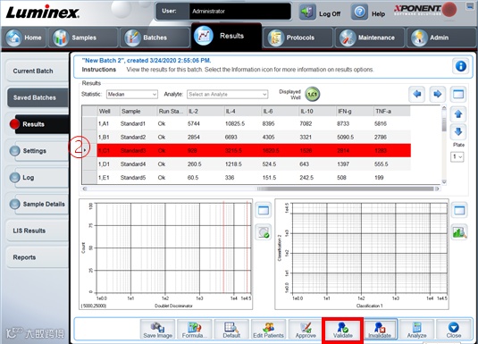 3. 启用单孔标准品中特定数据:点选欲启用的分析物结果,点击 Validate,启用后不再显示红色标记
