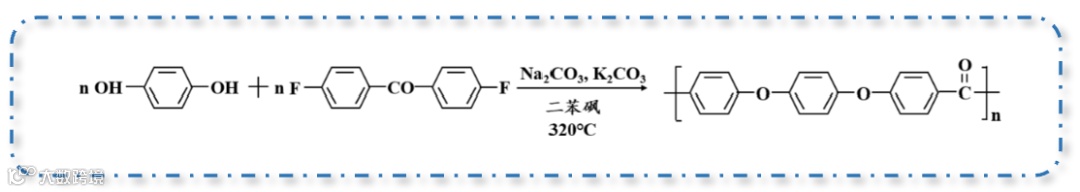 有亲核取代和亲电取代两种方式,主流方式为亲核取代。亲核取代是以4,4-二氟二苯甲酮、对苯二酚为原料,以碳酸钠为催化剂,以二苯砜为溶剂,在氮气的保护下,在逐渐升温至接近聚合物熔点的温度(280°C-340°C)时发生缩聚反应得到高分子PEEK树脂。亲核反应的原料需要高纯度的4,4-二氟二苯甲酮,成本较高,也导致了PEEK价格昂贵。