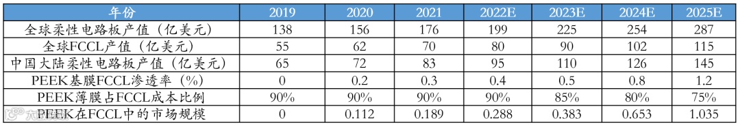 测算PEEK薄膜使用75微米厚度,价格2000元/kg,密度1.35g/cm3。预计到2025年PEEK薄膜在FCCL中的行业规模约为1.035亿美元。