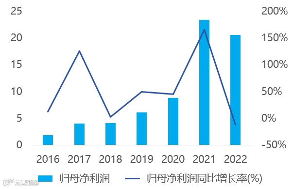 图:2018-2022年公司归母净利润(亿元)及增速(%)
