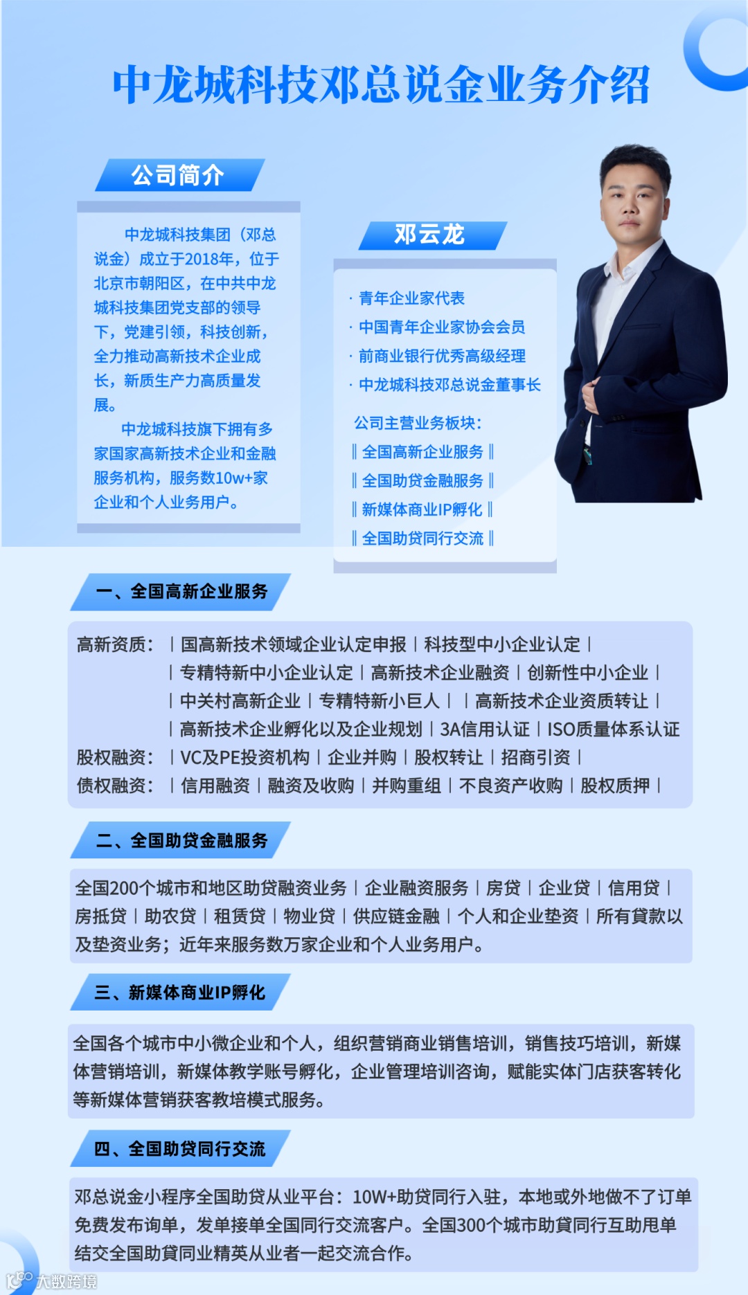 关注中龙城邓总说金;最实用的企业服务和贷款方案都在这里哦!