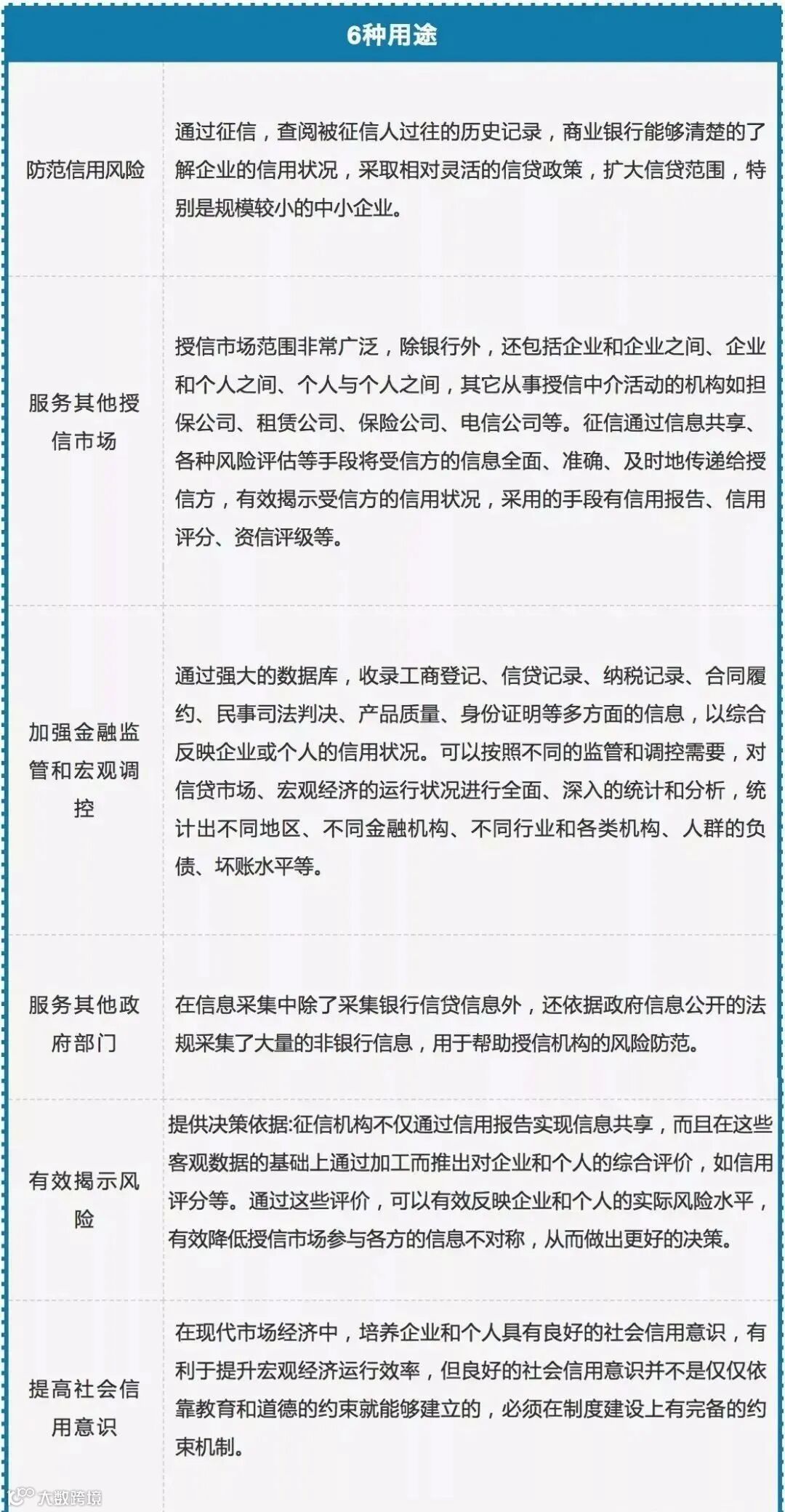 从服务对象的不同,可以概述征信具有六大作用:防范信用风险、服务其他授信市场、加强金融监管和宏观调控、服务其他政府部门、有效揭示风险、提高社会信用意识。