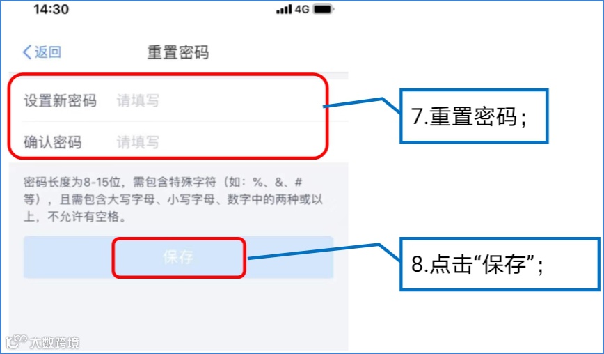 注意:重置密码,密码长度为8-15位,需包含特殊字符(如:%、&、#等),且需包含大写字母、小写字母、数字中的两种或以上,不允许有空格。