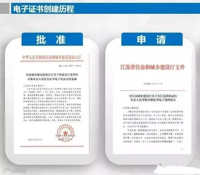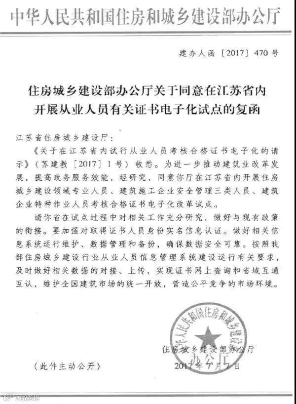 2017年7月7日,住建部批准江苏省住房城乡建设厅率先试行行业从业人员考核合格证书电子化试点。