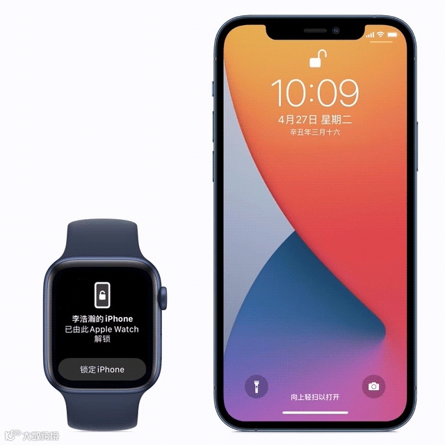 在 Apple Watch 已解锁的状态下,唤醒你的 iPhone 并看一眼屏幕,让它检测到佩戴口罩的面容,Apple Watch 就会替你解锁 iPhone。