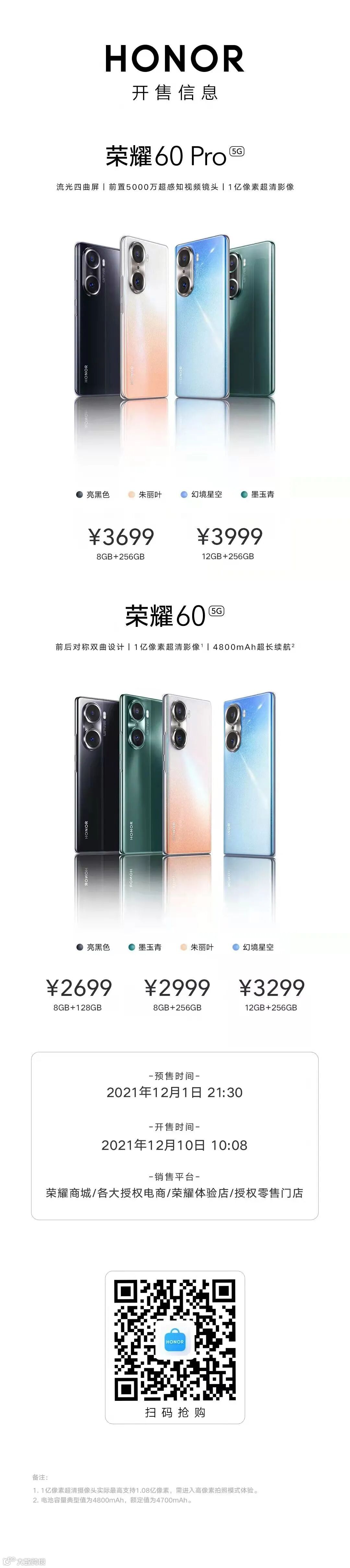 荣耀60拥有8GB+128GB,8GB+256GB,12GB+256GB三种版本,售价分别为2699元,2999元,3299元。荣耀60 Pro拥有8GB+256GB,12GB+256GB两种版本,售价分别为3699元,3999元。2021年12月10日,荣耀60系列将在线上线下平台全面开售,用户可登陆荣耀商城及各大授权电商平台或前往荣耀线下门店进行购买。戳链接https://www.hihonor.com/cn/msale/new.html?cid=128533迅速预约!
