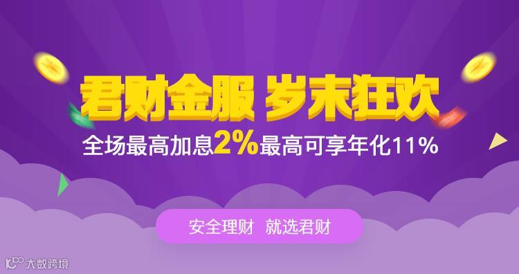 君财金服现在注册就送218元红包, 100元起投。此外,君财金服现在还有“岁末狂欢,全民加息”的活动,新年狂赚收益的秘籍就在这里!