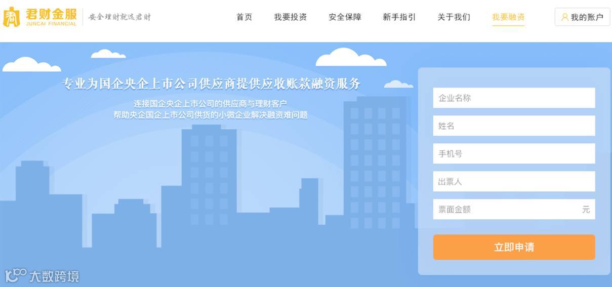 君财金服(www.juncaijinfu.com)是专注于供应链金融的互联网理财平台,专业为国企、央企、上市公司供应商提供应收账款融资服务,以移动互联网、金融服务、平台化、大数据为核心支撑,为有融资需求的国企、央企、上市公司的供应商和理财客户进行信息匹配,为平台客户提供安全无忧、收益稳健的优质理财项目,实现财富的稳健增值。