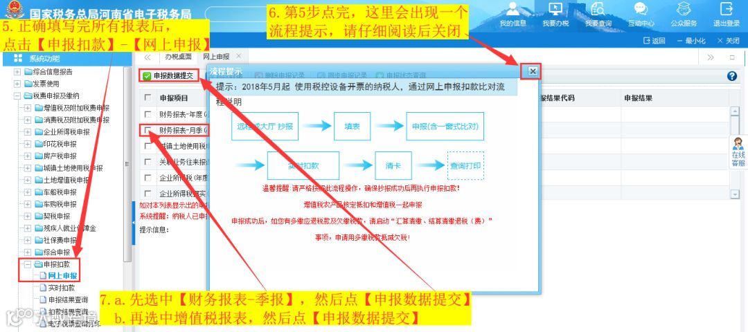 操作流程:登录,然后依次点击【我要办税】-【税费申报及缴纳】,依次打开需要报送的报表,然后填写财务报表和增值税报表(增值税报表需要先填附表保存,最后填主表保存),全部填写完成后依次点击【申报扣款】-【网上申报】,然后分别选中报表,点击【申报数据提交】成功后,如果有税款请点击【实时扣款】进行扣款,然后进开票软件进行反写,如果没有税款直接进开票软件进行反写。