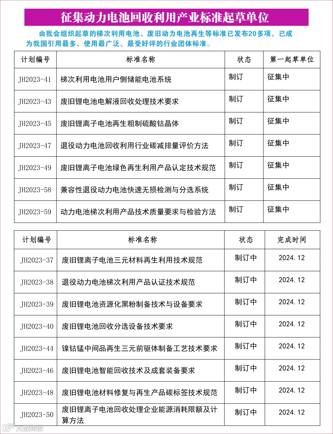 为贯彻落实《中华人民共和国标准化法》、国务院《深化标准化改革方案》、国家标准化管理委员会和民政部发布的《团体标准管理规定》(国标委联【2019】1号)等文件精神,加强行业标准体系建设,提升团体标准对市场发展的技术支撑和基础保障水平。废旧锂电池是宝贵的“城市矿山”,退役动力电池绿色再生和梯次利用是保障报废动力电池材料高效回收与循环利用的重要基础。由中国电子节能技术协会电池回收利用专业委员会组织的《废旧锂离子电池三元材料再生利用技术规范》、《废旧锂离子电池再生 粗制硫酸钴晶体》等多项团体标准,现面向相关行业征集标准起草单位。