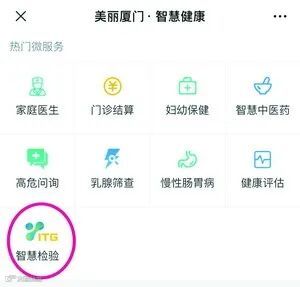 ▲在“美丽厦门智慧健康”公众号的“便民服务”页面可找到“智慧检验”。