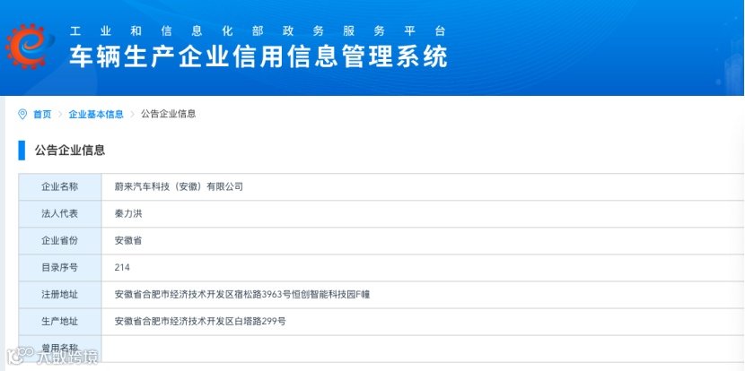 2023年12月,工业和信息化部政务服务平台车辆生产企业信用信息管理系统官网显示,蔚来汽车科技(安徽)有限公司已获得独立生产资质,生产地址为安徽省合肥市经济技术开发区白塔路299号。