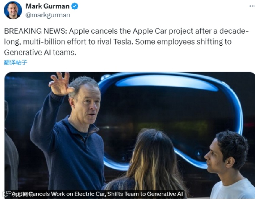 中工汽车网消息,2月27日,全球知名的科技记者马克·古尔曼深夜发布了一条重磅猛料:苹果公司已经决定取消搞了十多年的电动汽车项目,将团队转向生成式人工智能。