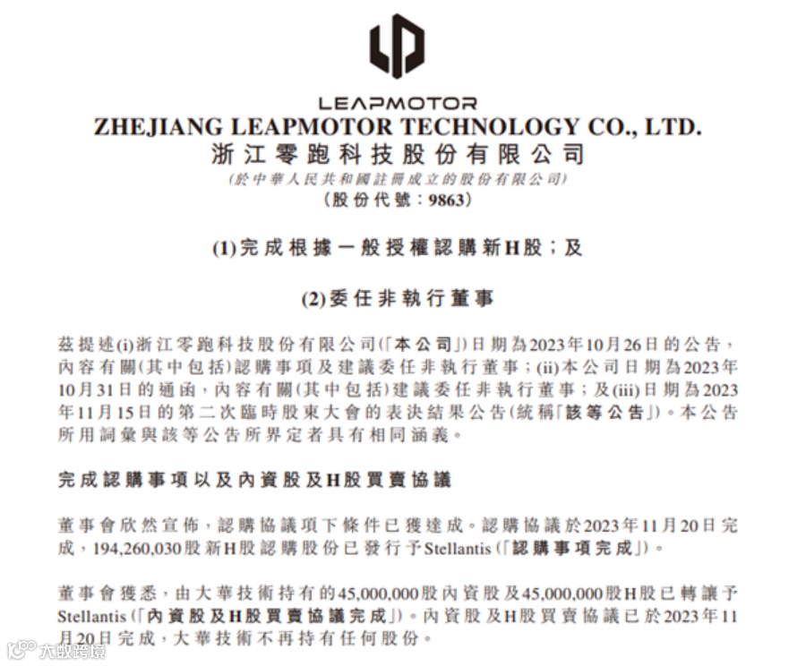 中工汽车网讯,11月20日,零跑汽车发布公告,1.94亿新H股认购已发行予Stellantis集团。协议完成后,股权架构变为:公司单一最大股东集团持股合计23.47%;Stellantis持股21.26%;其他股东持股55.27%;大华科技则不再持股。