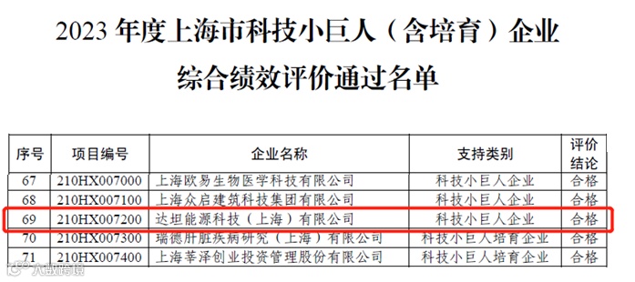 导读:上海市科学技术委员会7月11日公布了2023年度上海市科技小巨人(含培育)企业综合绩效评价结果,上海达坦能源