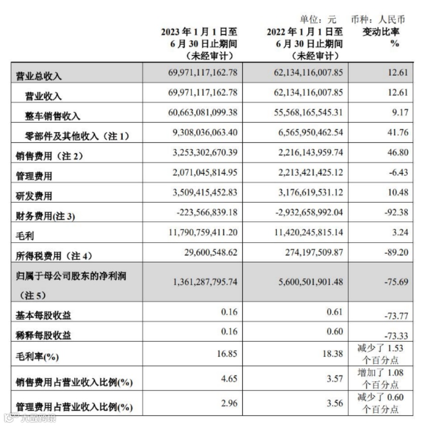 中工汽车网消息,8月30日,长城汽车发布2023年半年度报告财报显示,2023年上半年,长城汽车实现营业收入699.71亿元,同比增长12.61%;归母净利润13.61亿元,同比下滑75.69%;基本每股收益0.16元。