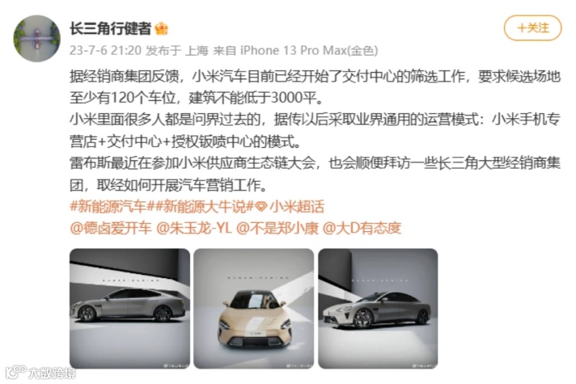 中工汽车网讯,7月7日,有微博简介为“汽车行业从业者、长三角一体化拥护者”的微博用户发文表示,据经销商集团反馈,小米汽车目前已经开始了交付中心的筛选工作。