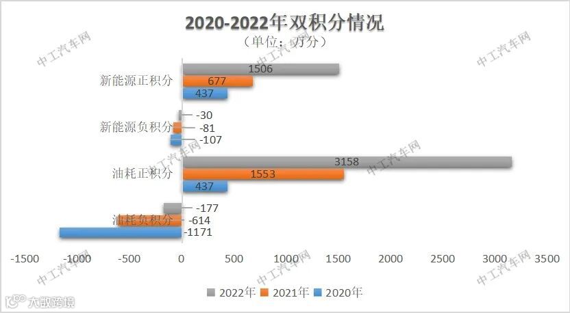 2022年,国内乘用车企业的油耗负积分为-177万分,油耗正积分3158万分,新能源负积分-30万分,新能源正积分1506万分。市场整体油耗积分的供应量是需求量的18倍,新能源积分的供应量则是需求量的50倍。