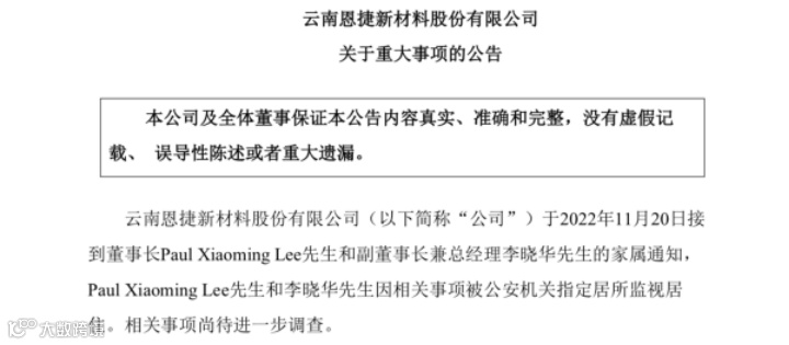 11月21日晚间,恩捷股份发布公告,公司已于2022年11月20日接到董事长Paul Xiaoming Lee先生和副董事长兼总经理李晓华先生的家属通知,Paul Xiaoming Lee先生和李晓华先生因相关事项被公安机关指定居所监视居住,相关事项尚待进一步调查。