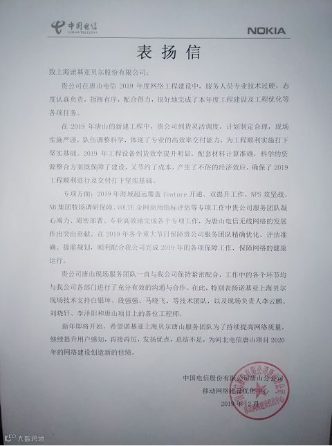 唐山电信工程团队:在2019年度的网络工程建设中,唐山电信工程团队合理制定计划、灵活调度资源,为工程顺利实施打下了坚实基础。2019年,海域超远覆盖feature开通、双提升工作、NPS攻坚战、NB集团牧场调研保障、VoLTE全网商用指标评估等专项工作均高效、高质完成;在各个重大节日保障工作中,现场服务团队提前规划、准确评估、精确优化,顺利配合唐山电信完成各项保障工作。