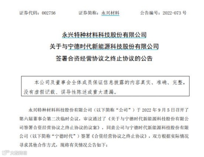 据中工汽车网获悉,9月5日晚间,永兴材料发布公告称,公司当日召开董事会通过议案,决定与宁德时代签署《合资经营协议之终止协议》,主要是当前因项目筹建过程中实际出现和面临的新情况,双方将根据实际情况寻求其他合作方式。