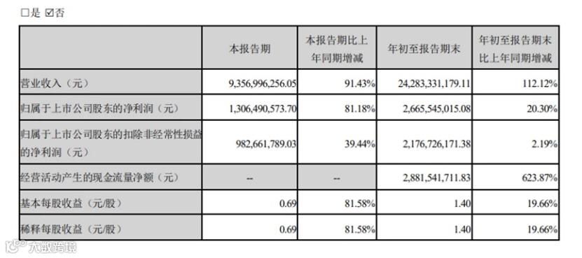 其中,第三季度,亿纬锂能营业收入为93.57亿元,同比增长91.43%,归属于上市公司股东的净利润13.06亿元,同比增长81.18%,结束了今年一、二季度净利润连续同比下降的局面。