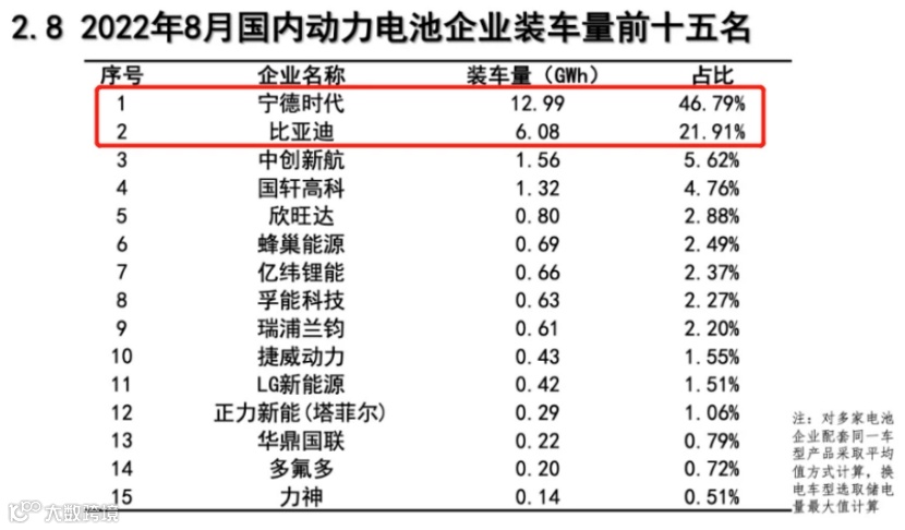 8月,我国动力电池装车量27.75GWh,同比增长121.3%,环比增长14.7%,1—8月,我国动力电池累计装车量162.1GWh,累计同比增长112.3%。其中,宁德时代仍牢牢占据榜首位置,装车量为12.99GWh,市场份额为46.79%,比亚迪则排名第二,市场份额为21.91%。