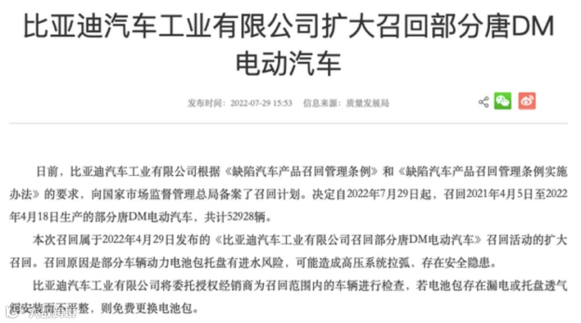 而本次召回正是属于2022年4月29日发布的《比亚迪汽车工业有限公司召回部分唐DM电动汽车》召回活动的扩大召回。