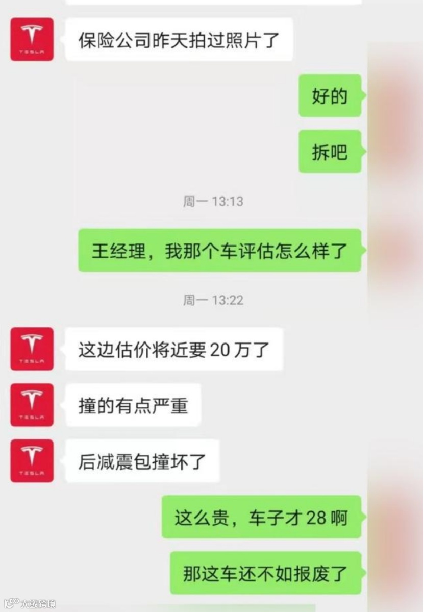 看似简单的小事故,得到的维修价格却让车主“崩溃”。与车主对接的客户经理给出了预估维修费用为20万的回复,这一价格显然很难让人接受,车主也表示“这么贵,车子才28啊”,“那这车还不如报废了”。