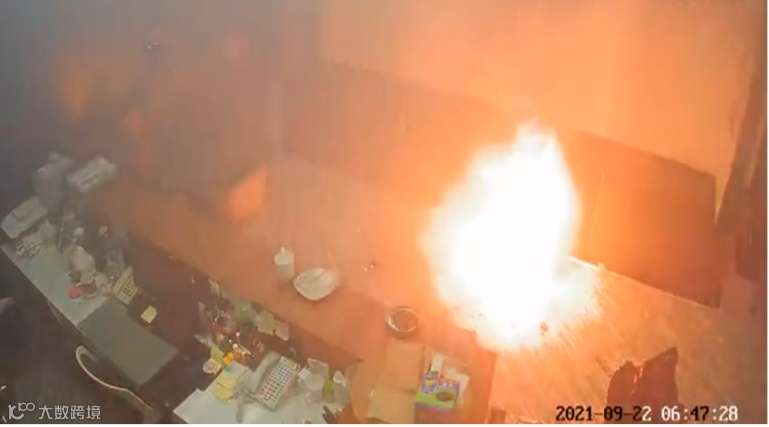 2021年9月,上海徐汇虹漕路68号锦和中心一家公司的前台,放置在公司吧台处的电瓶,突然冒出滚滚浓烟,随后爆裂起火,所幸电瓶爆燃时并未充电,消防喷淋及时运作,未酿成大灾。