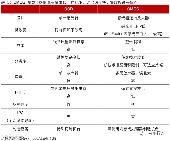 图像传感器将光学镜头中接收到的光信号转换为电信号,它是数字成像系统的核心器件, 它与镜头、图像信号处理器共同决定了图像的质量及摄像头的价值。行业内存在 CMOS 与 CCD 两种技术方案,由于在成本、功耗、读取速度等方面 CMOS 领先于 CCD,目 前主要使用 CMOS 图像传感器作为汽车摄像头的图像传感器。