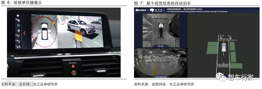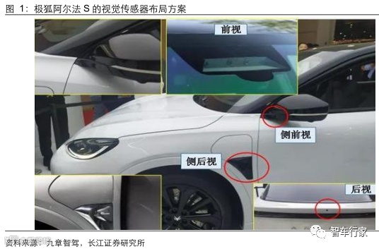 4 颗环视摄像头能将汽车顶部各个方向的鸟瞰画面拼接起来,以动态的形式显示在车内的液晶屏上;此 外,可以自动识别停车通道标识、路缘和附近车辆。4 颗前视摄像头(1 个双目 + 1 个长 焦 + 1 个广角),可以监测前方突如其来的行人车辆。4 颗侧视摄像头可以用来防止盲 区,保证行驶安全。1 颗后视摄像头可以辅助实现自动泊车功能。