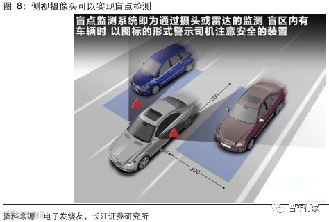 侧视布局的摄像头布局一般为 2-4 颗,解决盲区的检测。侧视摄像头主要的配置方案一 般为后视 2 颗或者前后视 4 颗,分布于车两侧。辅助驾驶领域,侧视摄像头可以提供盲点预警,应对侧边车辆超车。自动驾驶对于车辆视觉覆盖的范围有较高要求,侧视摄像 头可以进一步填补车辆盲点。
