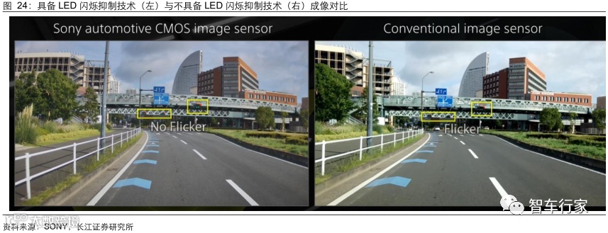 LED 闪烁抑制:目前的 LED 灯频率多为 90Hz,通常一个亮暗周期约 11 毫秒,若 汽车 CIS 曝光时间较短会导致信息缺失或错误。因此,用于识别交通信号灯、公 交站牌灯等灯光的 CMOS 图像传感器需要具备 LED 闪频抑制技术,这对于实现 更高等级的自动驾驶意义重大。