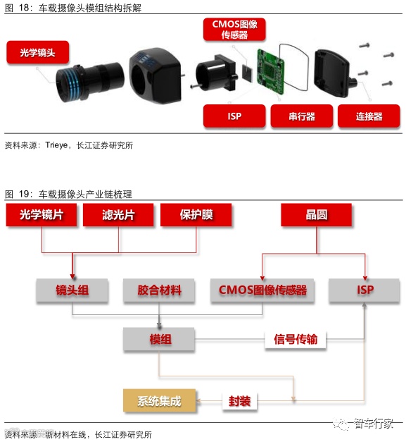镜头组:包含光学镜片、红外滤光片和保护膜。镜头组作用主要在于将光线汇聚至 图像传感器,其透光率以及折射角度会影响到进入图像传感器像素点的光线数量。在材质方面,玻璃镜片的透光性能优于塑料镜片,但在成本方面处于劣势,车载镜 头出于可靠性以及性能考虑会采用玻璃镜片。