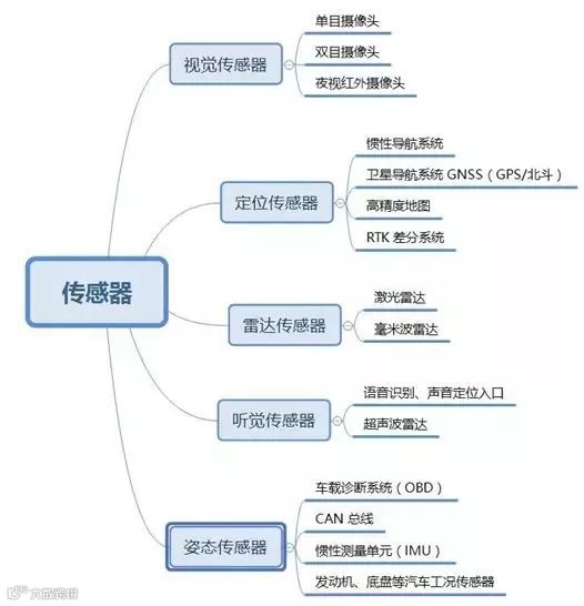 智能车辆的传感器可以分为视觉传感器、定位传感器、雷达传感器、听觉传感器和姿态传感器。其中视觉传感器可以分为单目摄像头、双目摄像头、夜视红外摄像头;定位传感器可以分为惯性导航系统、卫星导航系统(GNSS)、高精度地图、实时动态(RTK)差分系统;雷达传感器可以分为激光雷达和毫米波雷达;听觉传感器可以分为语音识别、声音定位入口;姿态传感器可以分为车载诊断系统(OBD)、CAN 总线、惯性测量单元(IMU)、发动机等汽车工况传感器。主要的传感器为激光雷达、毫米波雷达、摄像头、超声波雷达、GNSS 辅助传感器,其中 GNSS 辅助传感器包括惯性导航系统和 RTK 差分系统。