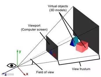 实际的激光雷达是先发射激光束再接收返回的激光束而获取到点的坐标,并且其中还要依靠光学扫描器和光学检测器才能完成这一复杂的过程,而仿真的激光雷达只需要模拟激光器,也就是激光发射装置,进而获取到点的坐标,最后绘制成图即可。根据仿真经验,可以考虑使用 OpenGL 中透视投影的一点透视的方式设置相机视角,然后通过编写 shader 从相机中获取点数据。如图 3-1 所示,透视投影的视线(投影线)是从视点(观察点)出发,所有视线从视点出发,视线是不平行的。所以可以用 OpenGL 的配置透视投影的相机来充当激光雷达的观察方式,然后从相机中设法取出在该视角下观察场景的位置信息即可完成激光雷达的模拟。那么如何设置相机呢?首先,在使用 OpenGL 的透视投影的方式获取点的数据时,根据 HDL-64E 的水平方位角为 360°,垂直方位角为 26.8°,扫描最长距离为 120 m,考虑使用四个相机拼合的方式实现,其中每个相机上仰角度为 2°,下俯角度为 24.9°,水平张角为 90°,远处裁剪处为 120,然后获取数据。