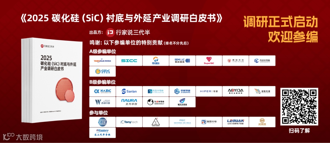 插播:天科合达、天岳先进、同光半导体、烁科晶体、浙江晶瑞、泰坦未来、天成半导体、南砂晶圆、芯聚能、三安半导体、安海半导体、德氪微电子、华卓精科、快克芯装备、阿尔法半导体、科友半导体、京航特碳、恒普技术、奥亿达新材料、创锐光谱、西湖仪器、北方华创、九域半导体、晶飞半导体、凌锐半导体、昕感科技、羿变电气、国扬电子、瞻芯电子、瑶芯微、科利金、中电化合物、东尼电子、西格玛、铭扬半导体、瑞霏光电、力冠微、芯研科、芯三代、格力电子等已确认参编《2025碳化硅衬底与外延产业调研白皮书》及《2025碳化硅器件与模块产业调研白皮书》,参编咨询请联系许若冰(hangjiashuo999)。