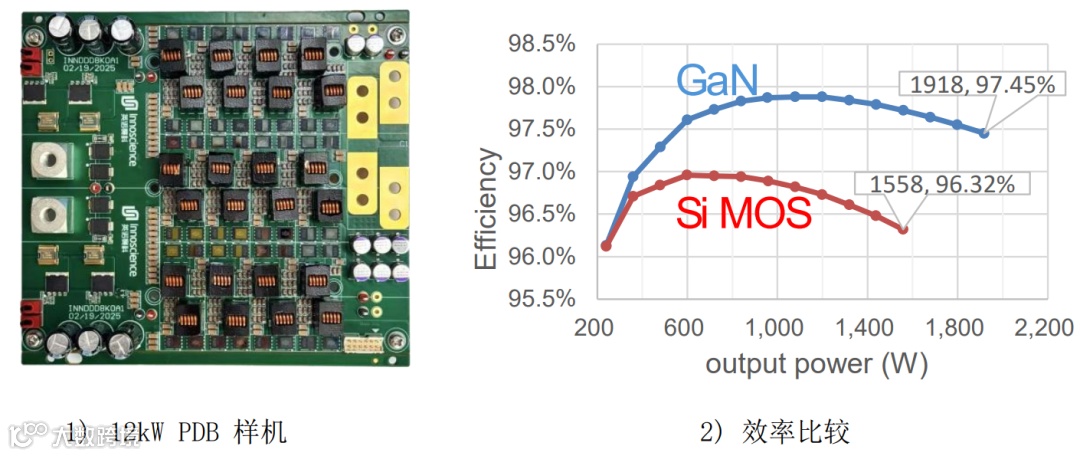 相比之下,英诺赛科采用100V GaN HEMT消除了反向恢复损耗,并将驱动损耗降低了80%。与此同时,基于该器件的54V–12V 12kW电能分配板 (PDB) 在115℃工作温度下,可提供1.918kW的功率,比采用Si MOSFET设计提高了23%。