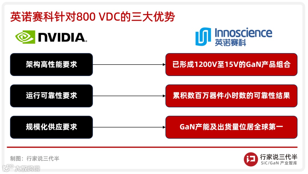 那么,英诺赛科为何能脱颖而出,率先获得英诺赛科的青睐?“行家说三代半”分析,这主要得益于英诺赛科在技术、可靠性、产能三大维度构建了与英伟达高度契合的系统性能力,为其800 VDC架构的落地提供了关键支持: