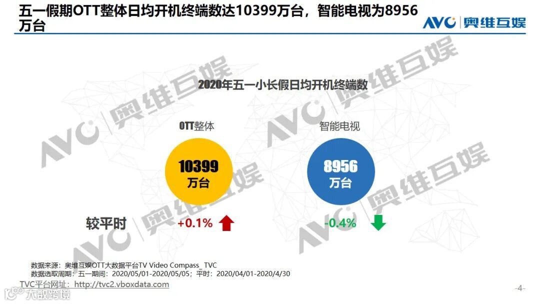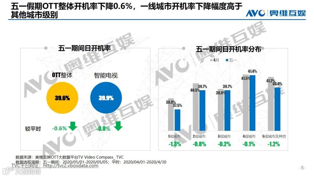 五一假期OTT端日开机终端数为10399万台,日均开机率为39.6%,环比下降0.6个百分点。