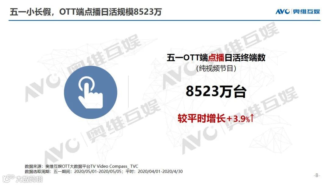 82.0%的OTT开机用户选择点播观看视频节目,点播日活终端规模达8523万台,较平时增长3.9%。