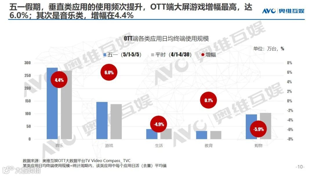 除观看视频外,用户也更多的选择使用大屏垂直应用欢度假期,音乐、游戏、教育日活规模增长,其中游戏类日活较平时增长6.0%。